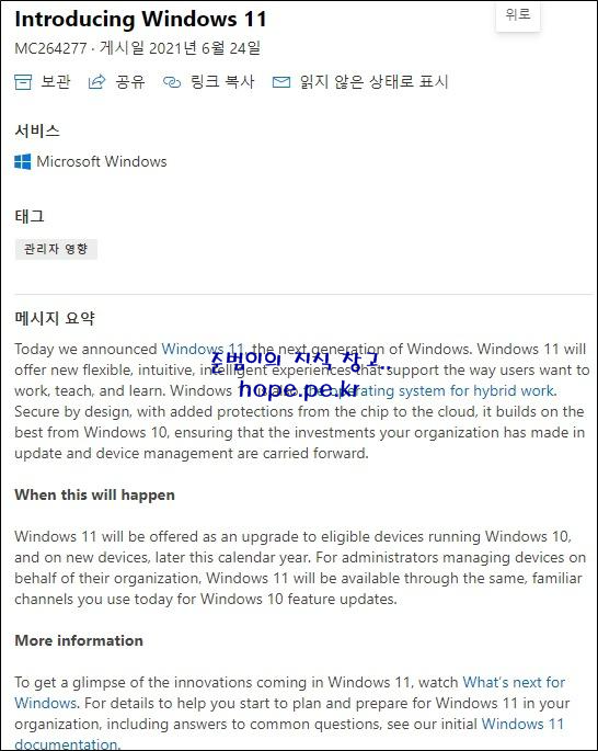 'Microsoft 365 관리 센터 > 메세지 센터' 에 보면, 'Introducing Windows 11(MC264277.게시일2021년6월24일)' 제목의 글이 업로드 되었습니다.