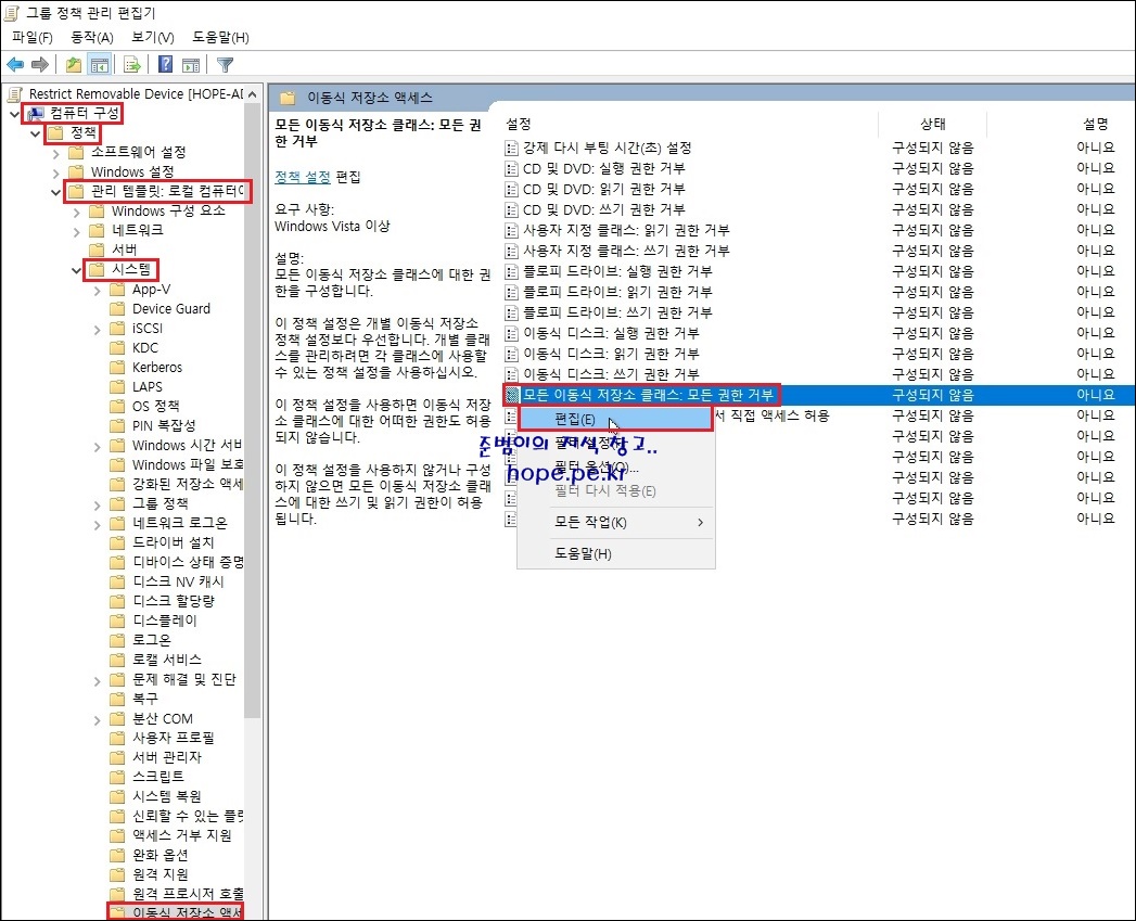 그룹 정책 관리 편집기 창에서, '컴퓨터 구성 > 정책 > 관리 템플릿 > 시스템 > 이동식 저장소 액세스' 로 이동 후 '모든 이동식 저장소 클래스: 모든 권한 거부' 설정에서 우클릭 후 '편집' 을 클릭 합니다.