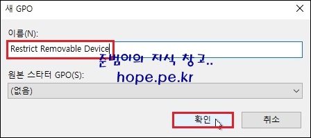 새 GPO 창에서, '그룹 정책 이름' 입력 후 '확인' 을 클릭 합니다.
