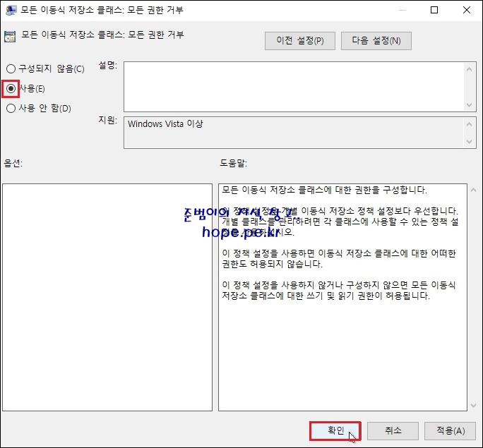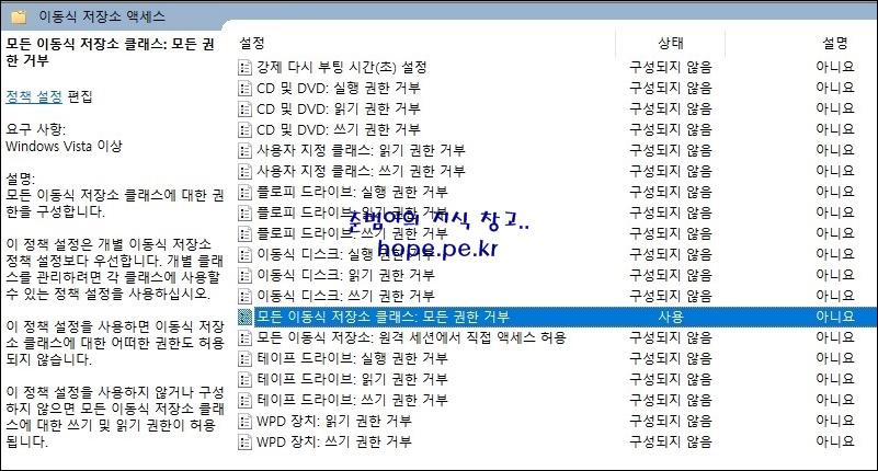 다음 화면과 같이 '모든 이동식 저장소 클래스: 모든 권한 거부' 설정이 사용으로 변경되였음을 확인 합니다.