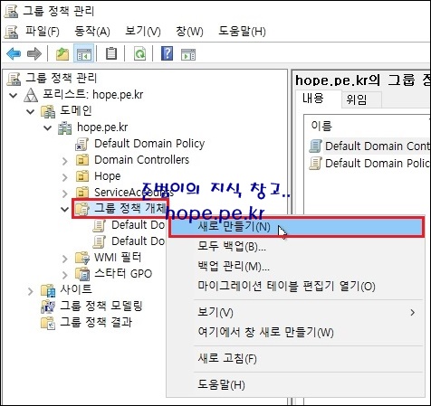 그룹 정책 관리 콘솔이 실행되면, '그룹 정책 개체' 에서 우클릭 후 '새로 만들기' 를 클릭 합니다.