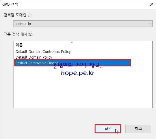 GPO 선택 창에서, 'USB 차단 정책' 선택 후 '확인' 을 클릭 합니다.