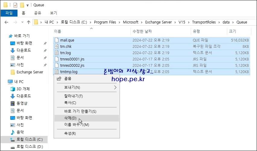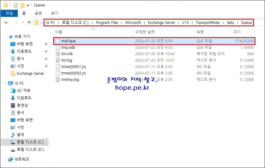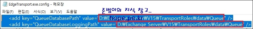 이에 최초 Exchange 디자인시 별도의 드라이브에 큐 데이터베이스 저장을 권장 드립니다.
