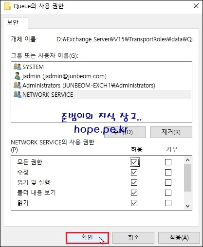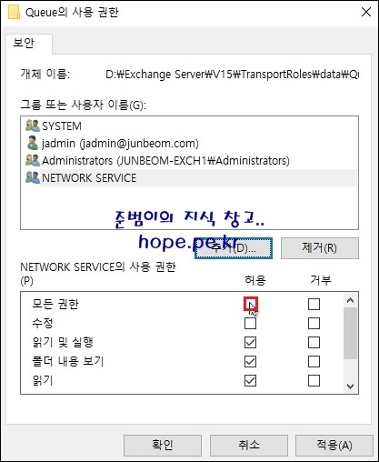 NETWORK SERVICE의 사용 권한 중 '모든 권한 > 허용' 에 체크를 합니다.