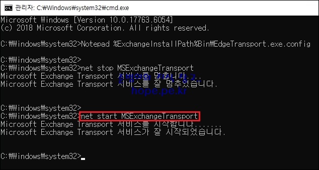 다음 명령을 실행하여, Exchange Transport 서비스를 중지 합니다.