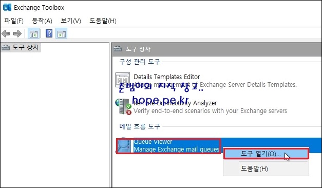 Exchange Toolbox 콘솔이 실행되면, 'Queue Viewer > 도구 열기' 를 클릭 합니다.