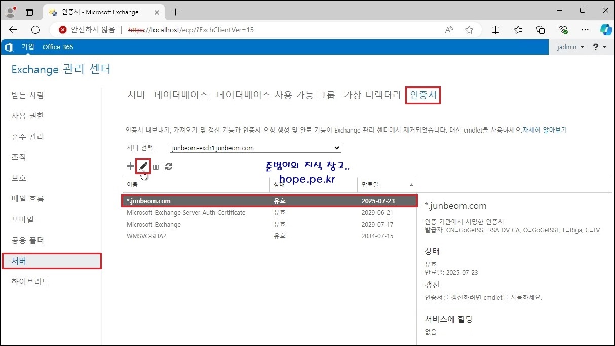 'Exchange 관리 센터 > 서버 > 인증서' 에 접속 후 서비스를 할당하기 위한 '인증서' 클릭 후 '편집' 을 클릭 합니다.