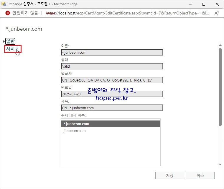 이전 포스팅 'Exchange Server 2019 인증서 설치' 에서는 Exchagne Server 에 단순히 인증서를 가져오는 방법에 대해서만 알아보았습니다.