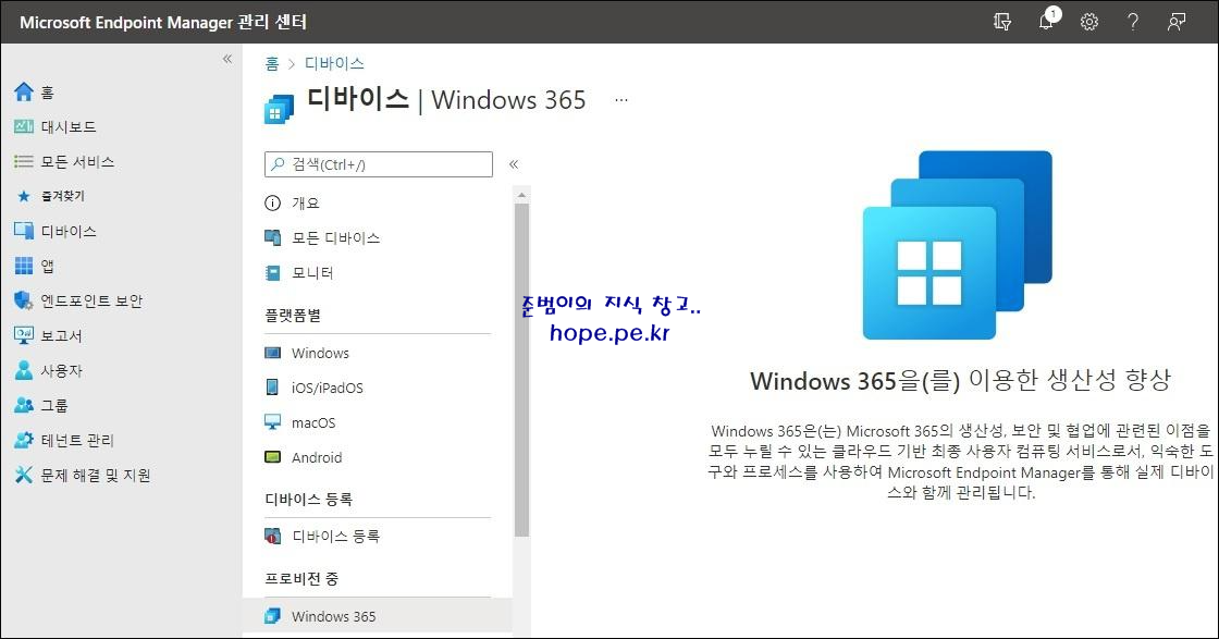 'Windows365' 페이지가 열리긴 하지만 등록된 디바이스가 없으니 당연히 아무것도 보이지 않습니다.