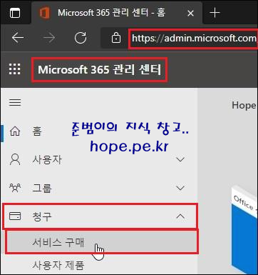 Microsoft 관리 센터(https://admin.microsoft.com) 접속후, '청구 > 서비스 구매' 를 클릭 합니다.