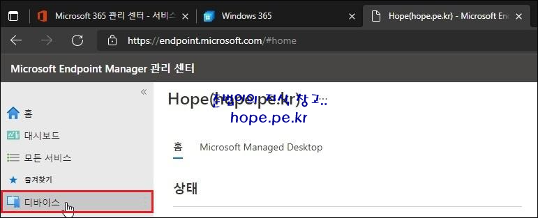Microsoft Endpoint Manager 관리 센터 홈 화면에서, '디바이스' 를 클릭 합니다.