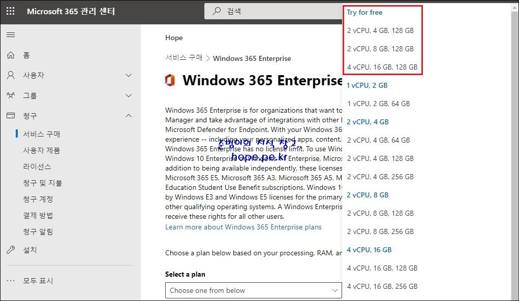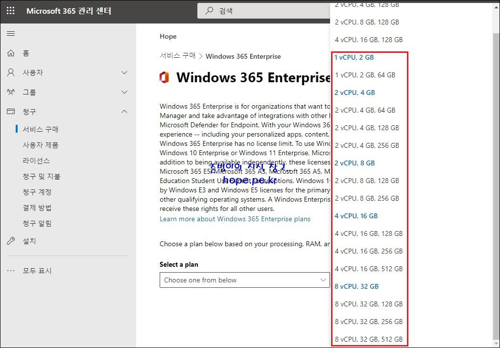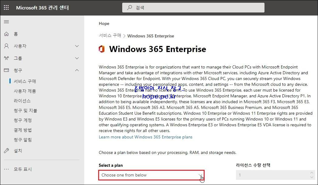 '서비스 구매 > Windows 365 Enterprise' 화면에서, 'Select a plan' 을 클릭 합니다.