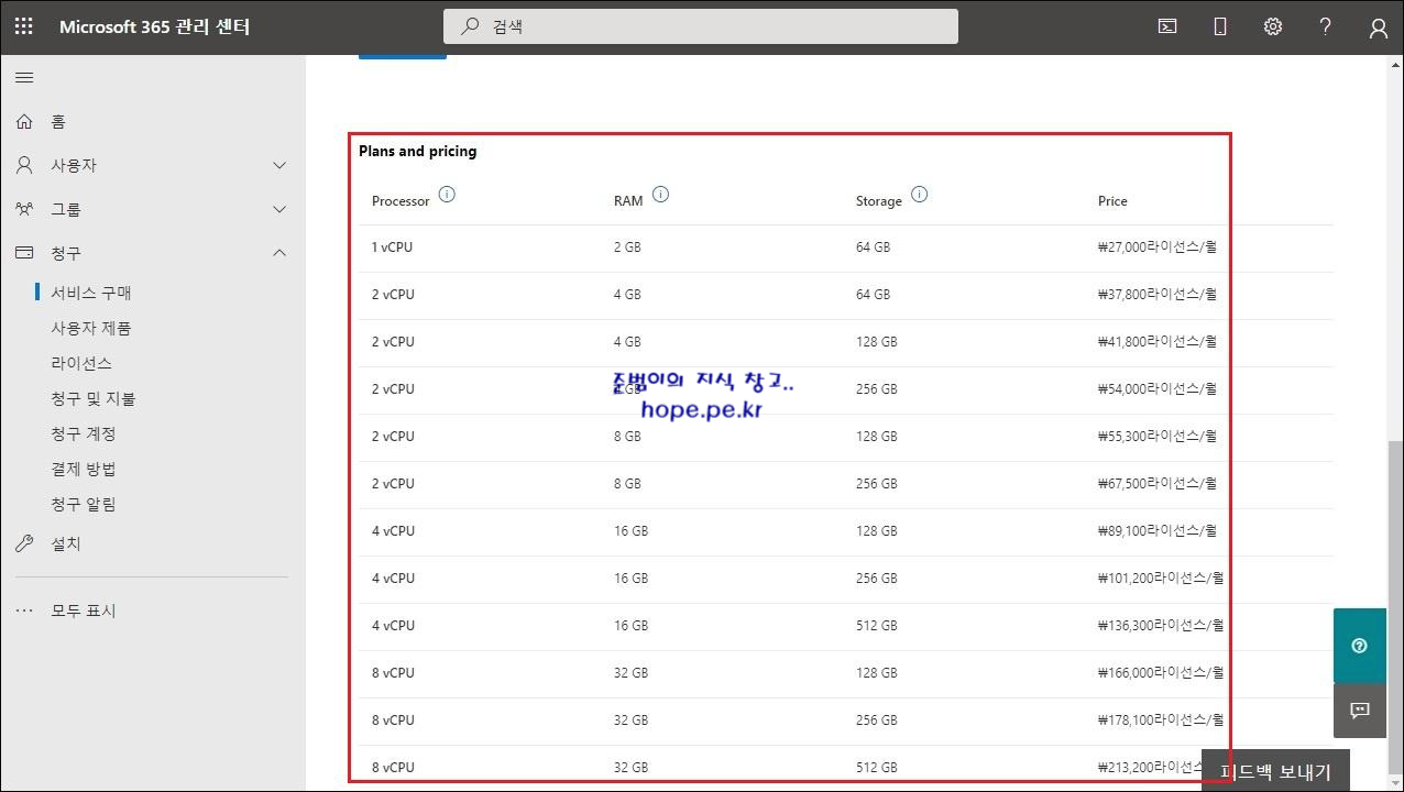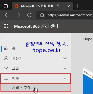 'Microsoft 365 관리 센터(https://admin.microsoft.com)' 접속후 '청구 > 서비스 구매' 를 클릭 합니다.