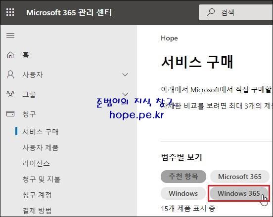 서비스 구매 화면에서, 범주별 보기에 'Windows 365' 를 클릭 합니다.