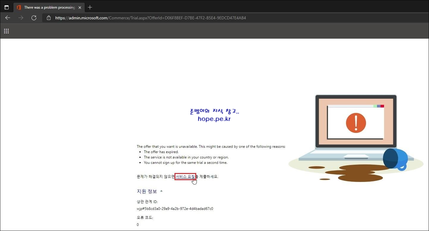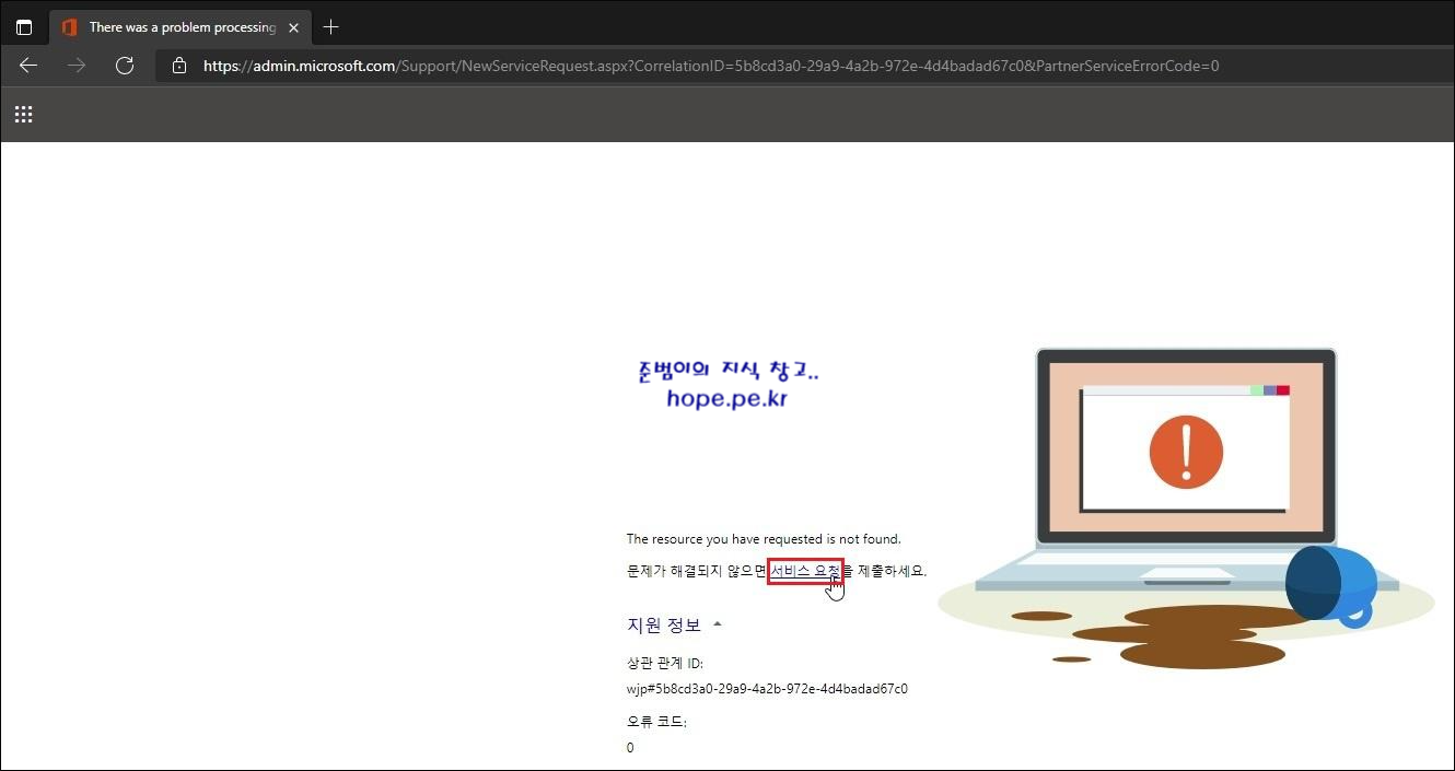 헉! 다음과 같은 에러가 발생합니다. '서비스 요청' 을 클릭해보겠습니다.