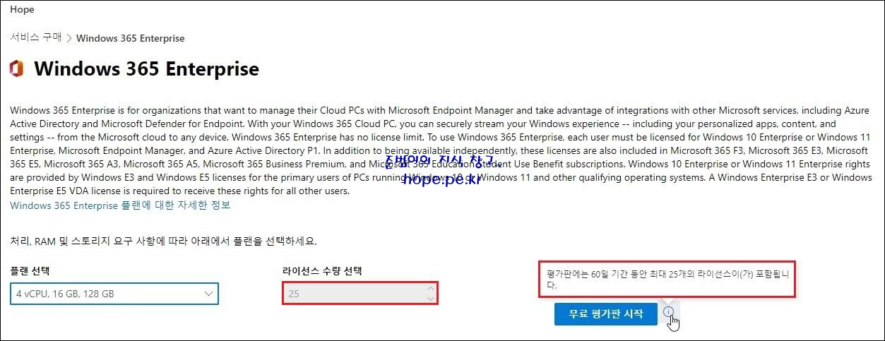 라이선스 수량은 25개 고정됩니다. 무료 평가판 시작 버튼 우측 '느낌표' 에 마우스 오버하니 '평가판에는 60일 기간 동안 최대 25개의 라이선스이(가) 포함됩니다.' 라고 안내 메세지가 표시됩니다.