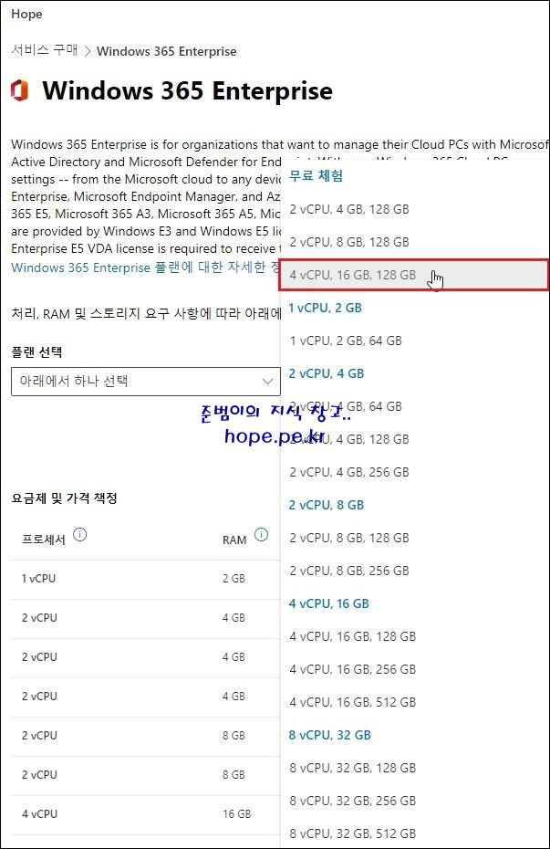 무료 체험 plan 중 성능이 가장 좋은 '4 vCPU, 16 GB, 128 GB' 를 클릭 합니다.