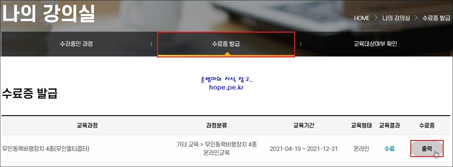 나의 강의실 > 수료증 발급 화면으로 이동후 '출력' 을 클릭하면 '교육수료증'을 출력할 수 있습니다.
