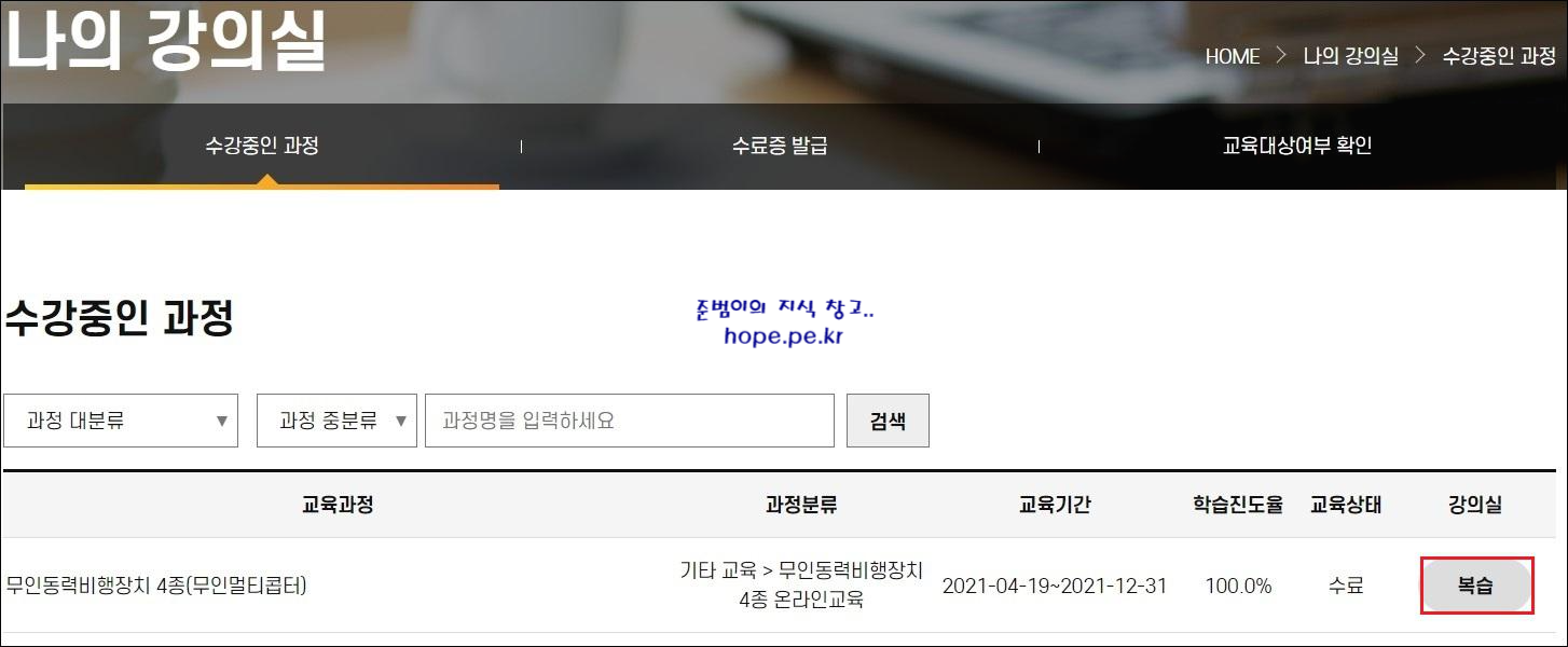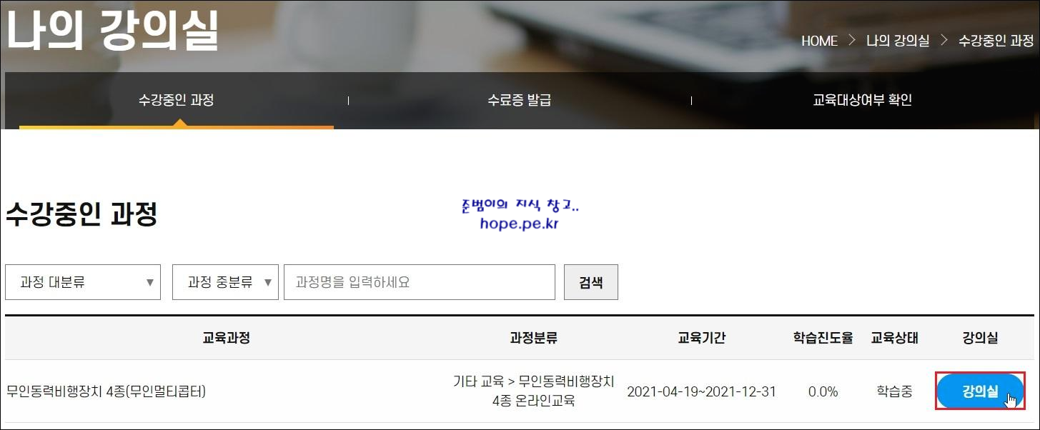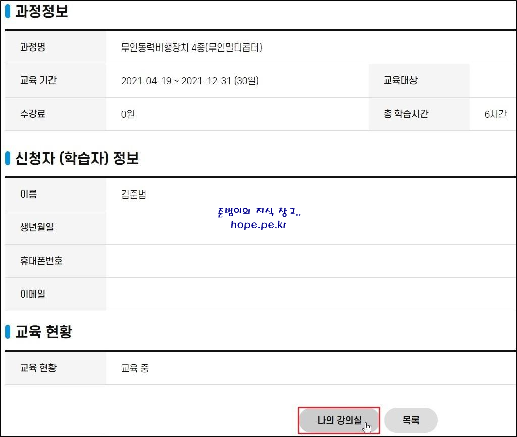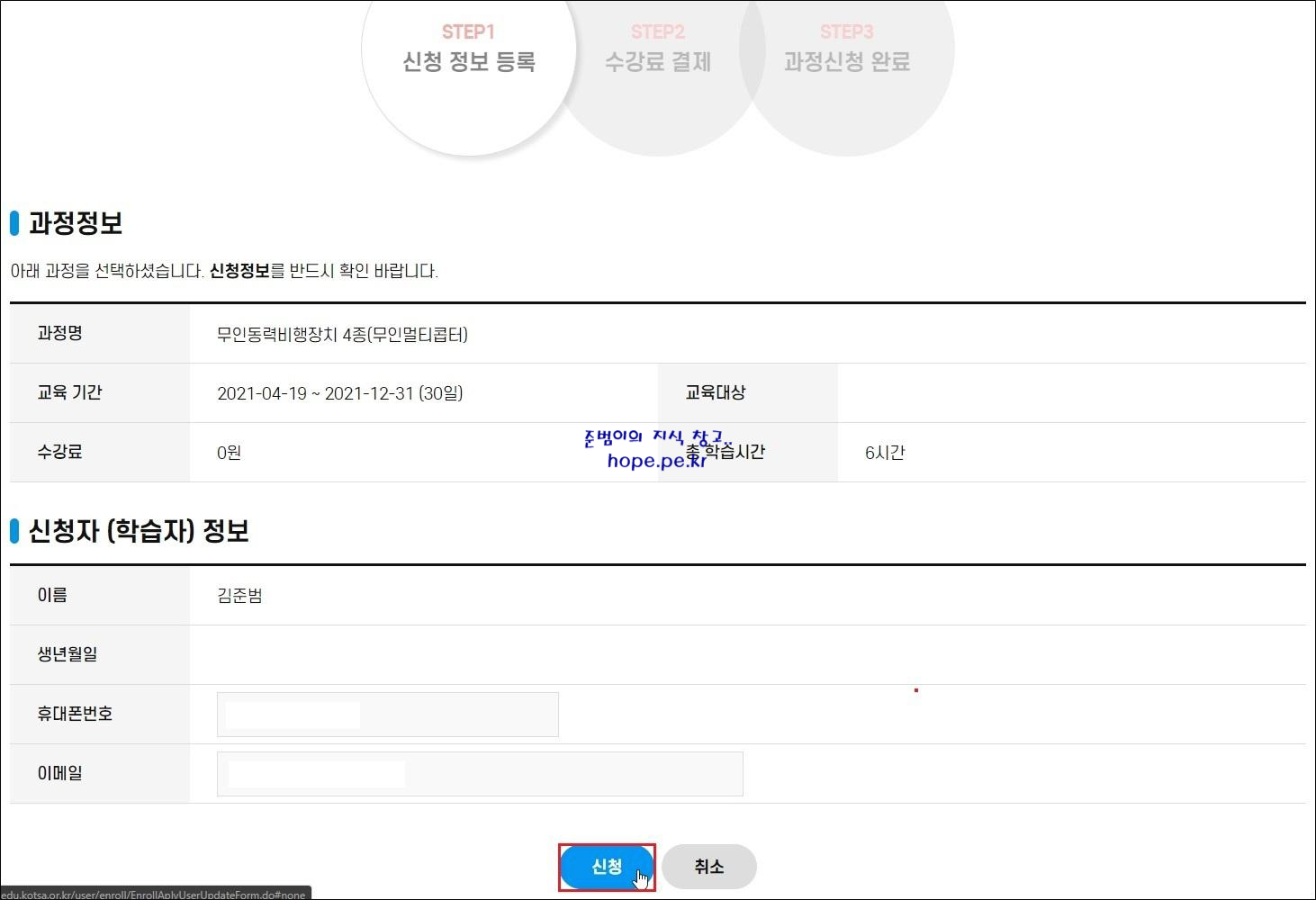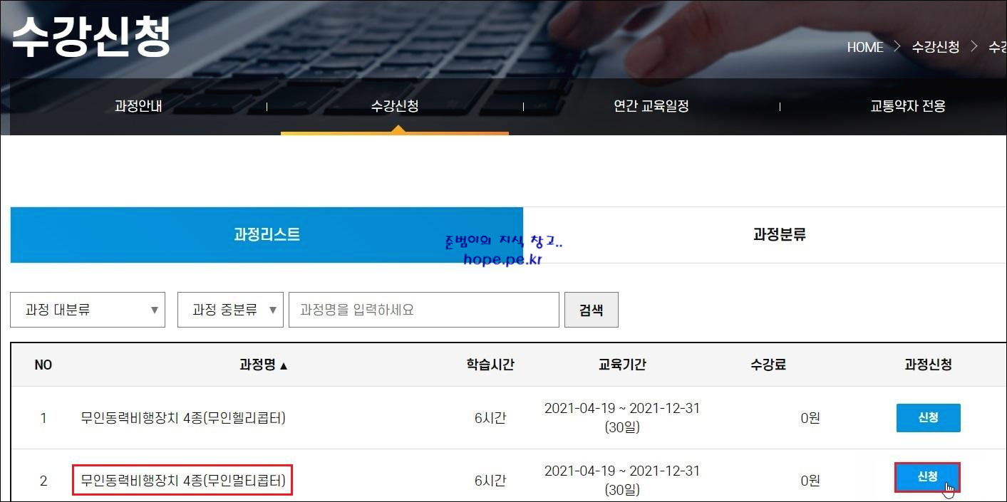 '무인동력비행장치 4종(무인멀티콥터)' 를 수강 '신청' 합니다.