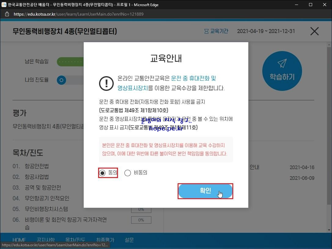 브라우저가 새 창으로 실행되며, 교육 안내창이 발생합니다. '동의' 클릭후 '확인' 을 클릭 합니다.