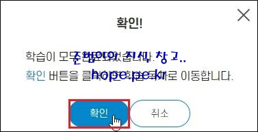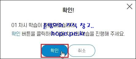 해당 차시 교육이 완료되면 확인창이 발생 합니다. '확인' 을 클릭 합니다.