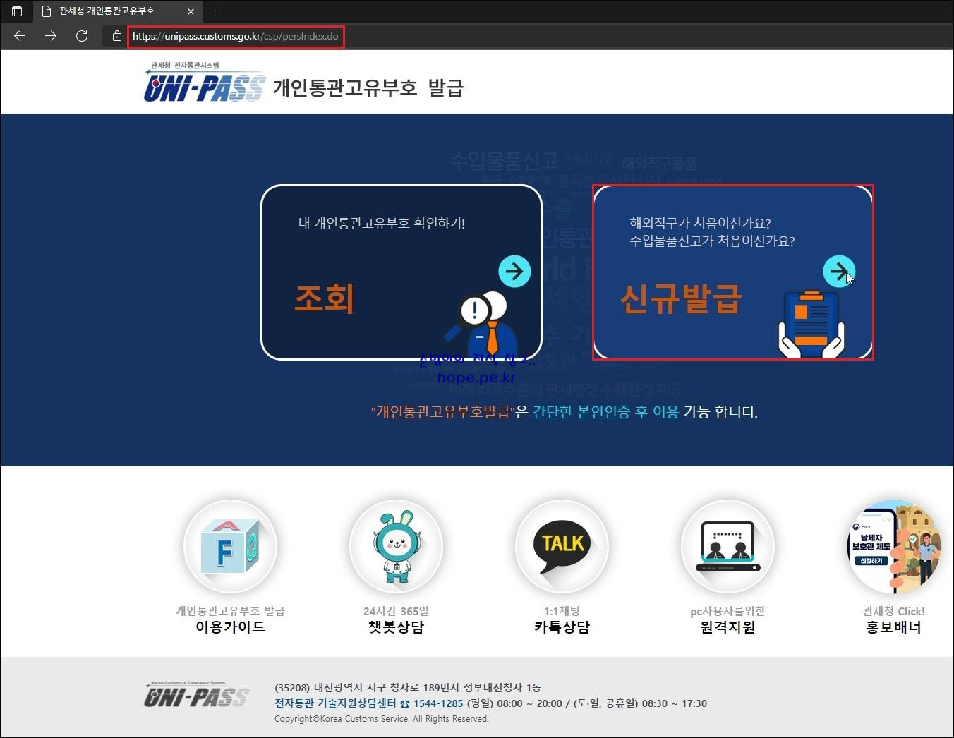 관세청 전자통관시스템 UNI-PASS 사이트에 접속후 '신규발급' 을 클릭 합니다.