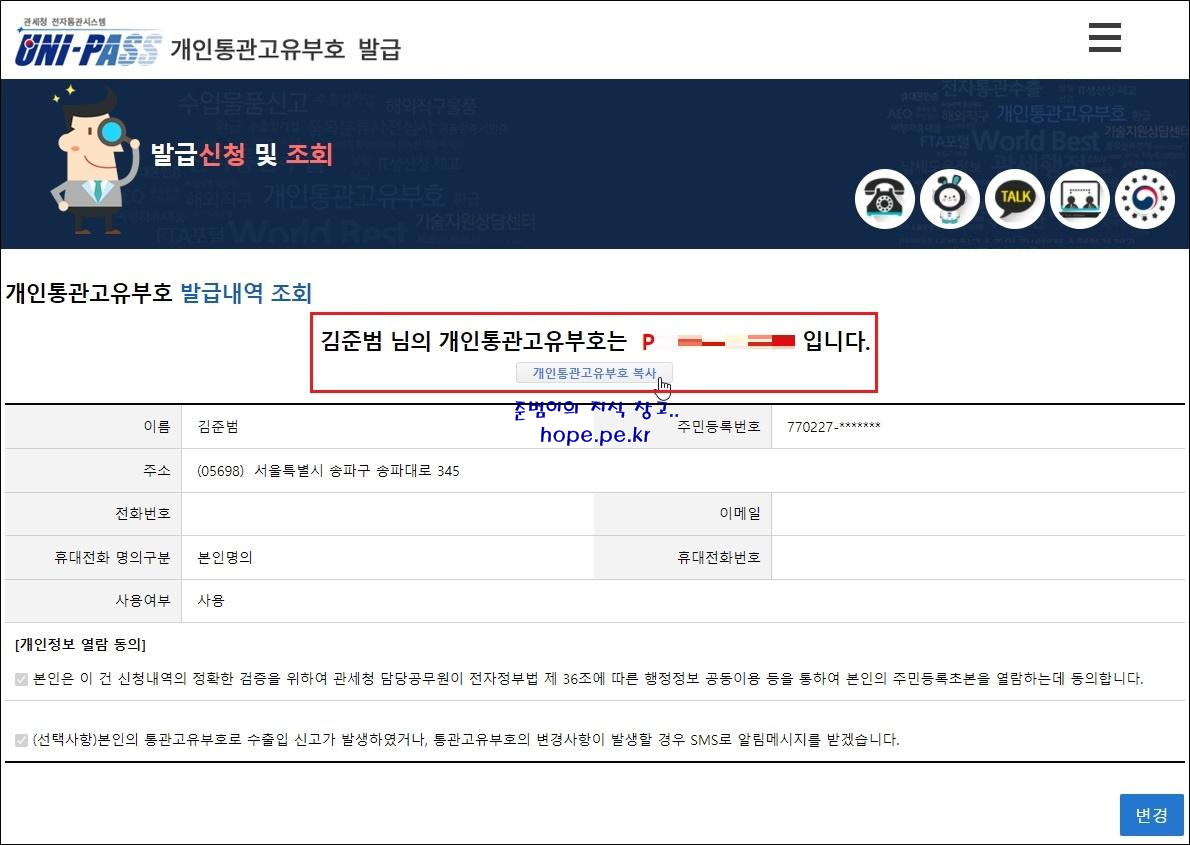 개인통관고유부호가 정상적으로 잘~ 발급 되었습니다. '개인통관고유부호 복사' 를 클릭하여 안전한 곳에 잘 저장하시면 됩니다.