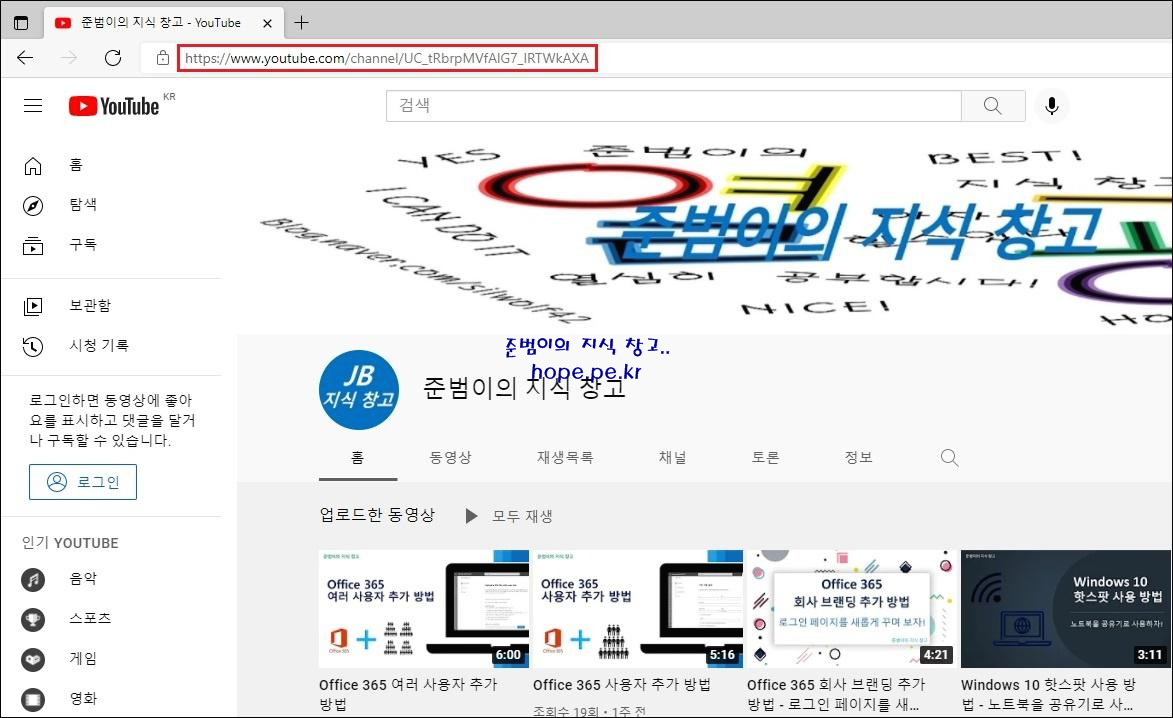 제 YouTube 채널(준범이의 지식 창고) 주소는 'https://www.youtube.com/channel/UC_tRbrpMVfAlG7_IRTWkAXA' 로서 복잡한 URL 입니다. 해당 주소를 복사 합니다.