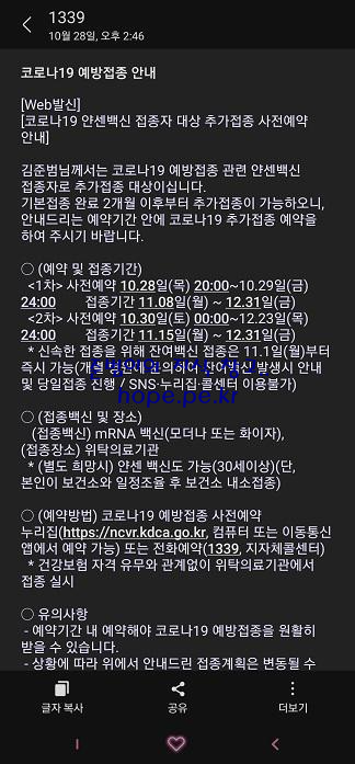10월말쯤 어느날 갑자기, '1339(질병관리청 콜센터)' 로부터, '코로나19 예방접종 안내' 문자 메세지가 수신되었습니다.