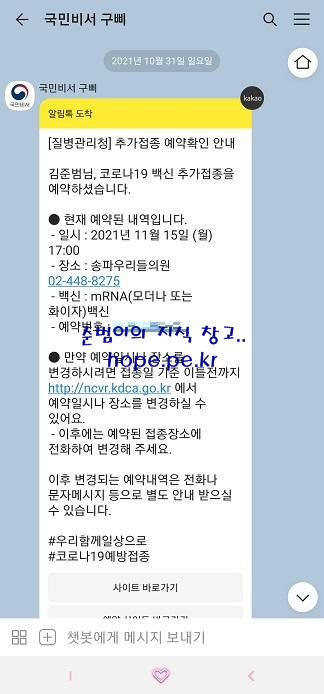 예약후 '국민비서 구삐' 에서 친절하게도 '추가접종 예약확인 안내' 카톡 메세지가 수신되네요.