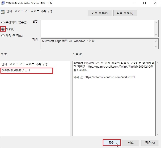엔터프라이즈 모드 사이트 목록 구성 창에서, '사용' 클릭후 'xml 파일 경로' 입력후 '확인' 을 클릭 합니다.