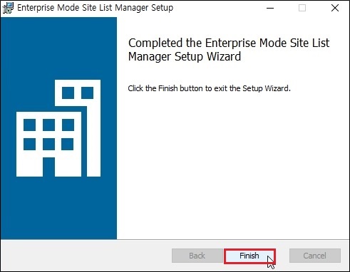 Completed the Enterprise Mode Site List Manager Setup Wizard 화면에서, 'Finish' 를 클릭 합니다.