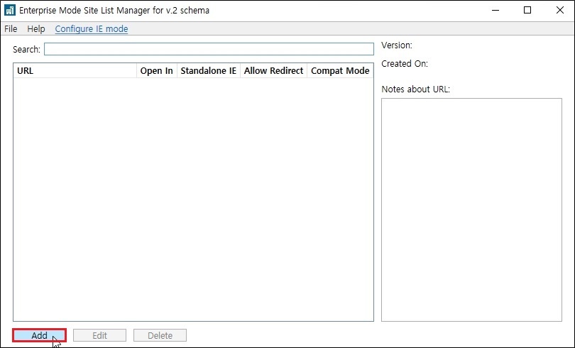 Enterprise Mode Site List Manager for v.2 schema가 실행되면 'Add' 를 클릭 합니다.