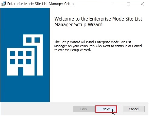 Enterprise Mode Site List Manager Setup 창에서, 'Next' 를 클릭 합니다.