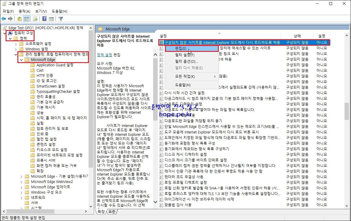 '컴퓨터 구성 > 정책 > 관리 템플릿 > Microsoft Edge' 의 '엔터프라이즈 모드 사이트 목록 구성' 에서 우클릭후 '편집' 을 클릭 합니다.