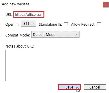 Add new website 창에서, 'Internet Explorer 모드로 사용할 사이트 URL' 입력후 'Save' 를 클릭 합니다.