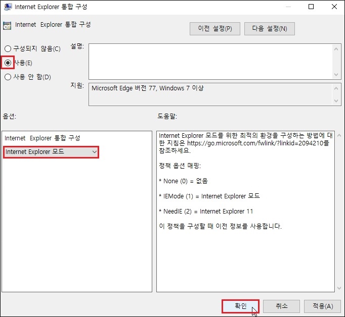 Internet Explorer 통합 구성 창에서, '사용' 선택후 'Interent Explorer 모드' 선택후 '확인' 을 클릭 합니다.