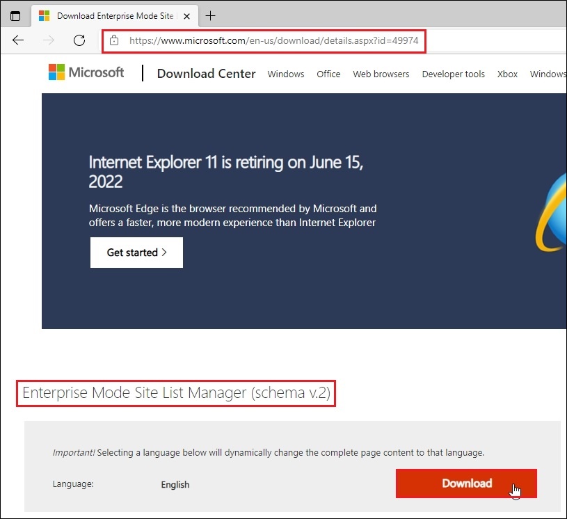 'Enterprise Mode Site List Manager (schema v.2) 다운로드 사이트' 접속후 'Download' 를 클릭 합니다.