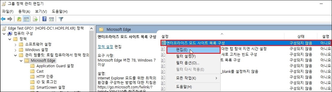 '컴퓨터 구성 > 정책 > 관리 템플릿 > Microsoft Edge' 의 '엔터프라이즈 모드 사이트 목록 구성' 에서 우클릭후 '편집' 을 클릭 합니다.