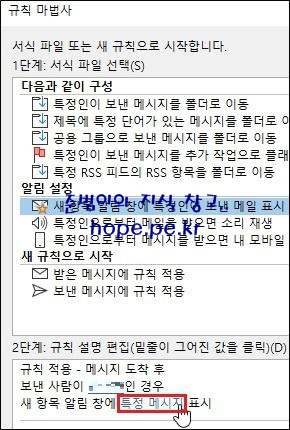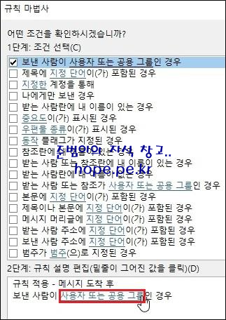 규칙 마법사 창의 첫화면에서, '1단계: 서식 파일 선택 > 알림 설정 > 새 항목 알림 창에 특정인이 보낸 메일 표시' 를 클릭후 '2단계: 규칙 설명 편집 > 사용자 또는 공용 그룹' 을 클릭 합니다.