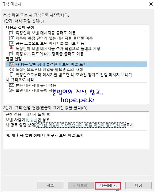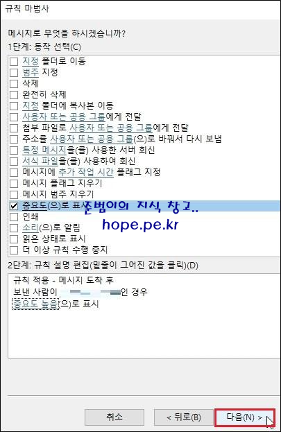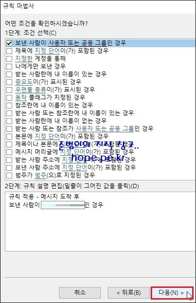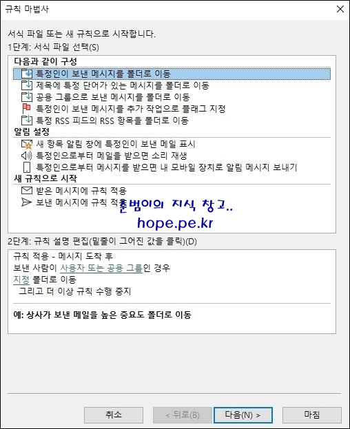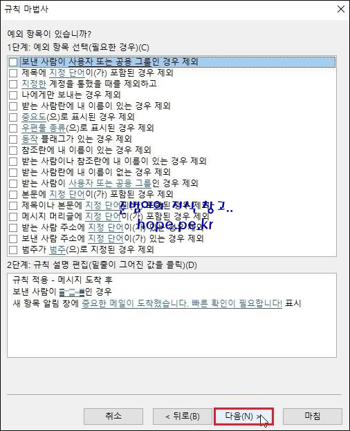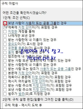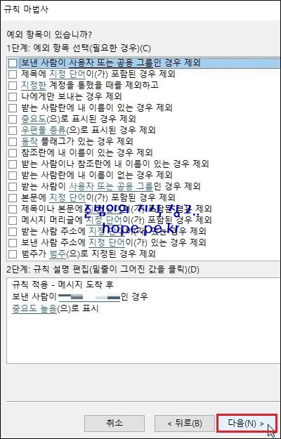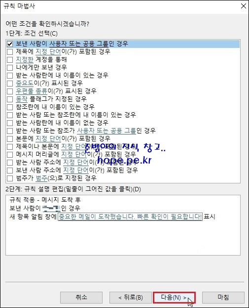 규칙 마법사 창의 첫화면에 있는 규칙을 클릭후 바로 사용해도 되고, '다음' 을 클릭하여 원하는 조건으로 규칙을 생성할 수도 있습니다.