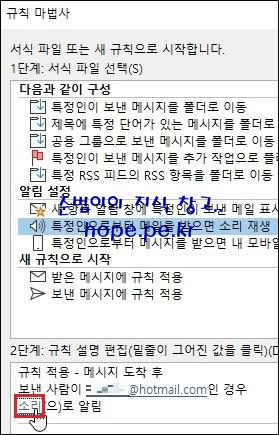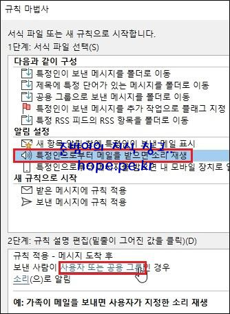 규칙 마법사 창의 첫화면에서, '1단계: 서식 파일 선택 > 알림 설정 > 특정인으로부터 메일을 받으면 소리 재생' 을 클릭후 '2단계: 규칙 설명 편집 > 사용자 또는 공용 그룹' 을 클릭 합니다.