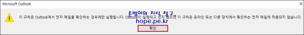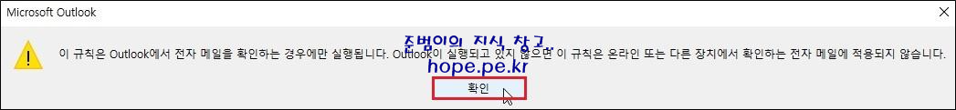 Microsoft Outlook 창에서, 규칙에 대한 주의사항을 인지후 '확인' 을 클릭 합니다.