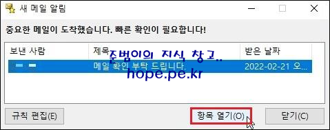 새 메일 알림 창에서, '항목 열기' 를 클릭 하면