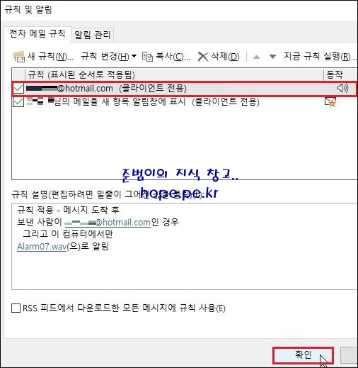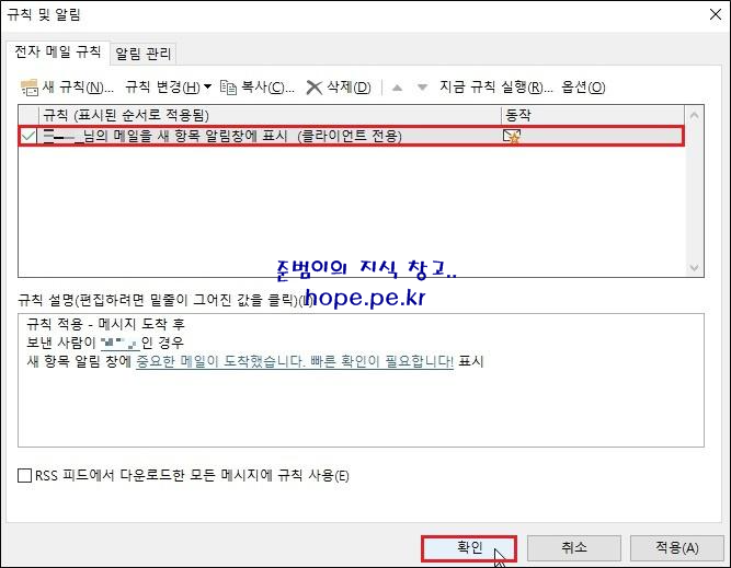 규칙 및 알림 창에, 방금 생성한 규칙을 확인할 수 있습니다. '확인' 을 클릭 합니다.
