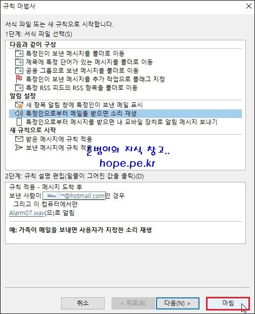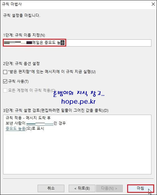 '1단계: 규칙 이름 지정' 에서 규칙의 이름을 그대로 사용하거나 적절한 이름으로 변경후 '마침' 을 클릭 합니다