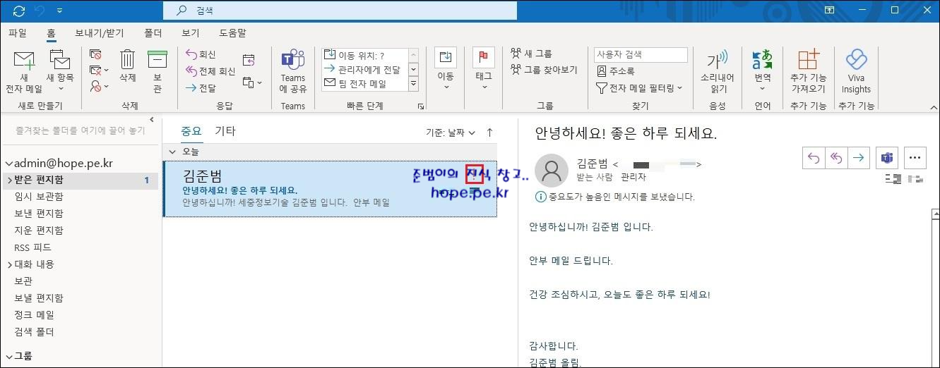 이제 규칙에서 지정한 사용자로부터 메일을 수신하면 자동으로 중요도 표시가 설정 됩니다. ^^