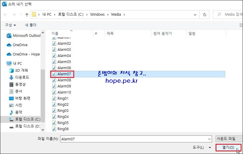 cf) 기본적으로 'C:\Windows\Media' 폴더 경로로 오픈됩니다. Windows 알림음 말고 다른 소리 파일을 선택해도 무방합니다.