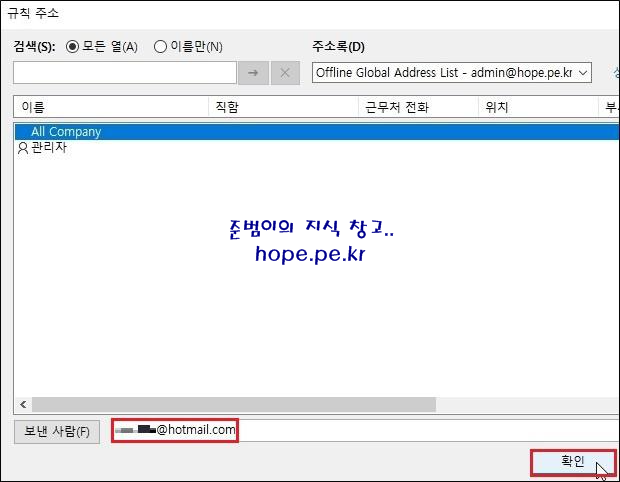 규칙 주소 창에서, 조직원을 선택하거나 외부 사용자 메일 주소 입력후 '확인' 을 클릭 합니다.