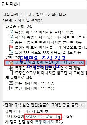 규칙 마법사 창의 첫화면에서, '1단계: 서식 파일 선택 > 알림 설정 > 새 항목 알림 창에 특정인이 보낸 메일 표시' 를 클릭후 '2단계: 규칙 설명 편집 > 사용자 또는 공용 그룹' 을 클릭 합니다.